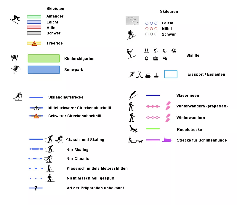 Auf wintersport-im-erzgebirge.de kommen Karten von OpenSnowMap.org zum Einsatz. Nachfolgend werden die Zeichen und Symbole der Karten genauer erklärt: